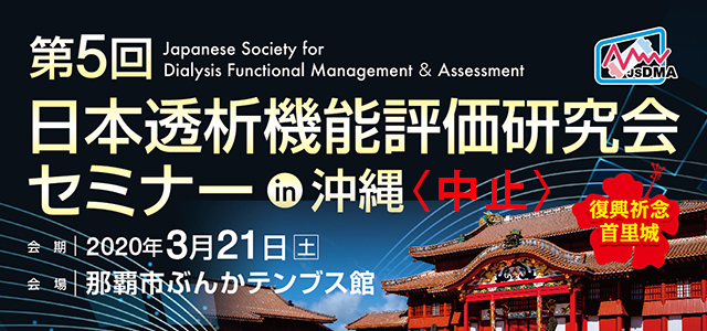 このたび、新型コロナウイルス感染症(COVID-19)の感染症が拡大している状況、また私たちは免疫力の弱い透析患者さんに接することが仕事となりますので、今回予定されておりました第5回日本透析機能評価研究会沖縄セミナーは延期とさせていただくこととなりました。(振替日時未定)